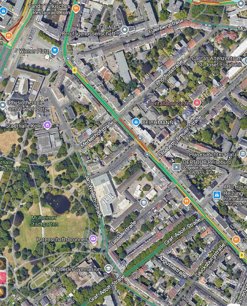 Mülheim ist ein sehr zentraler Stadtteil im rechtsrheinischen Köln. Der Charakter des Ortes ist vielschichtig: Rund um den wenige Fußminuten entfernten Wiener Platz pulsiert das Leben, aber es gibt auch grüne Flächen, z.B. den Mülheimer Stadtgarten, der nur wenige Schritte von dieser angebotenen Wohnung entfernt ist.