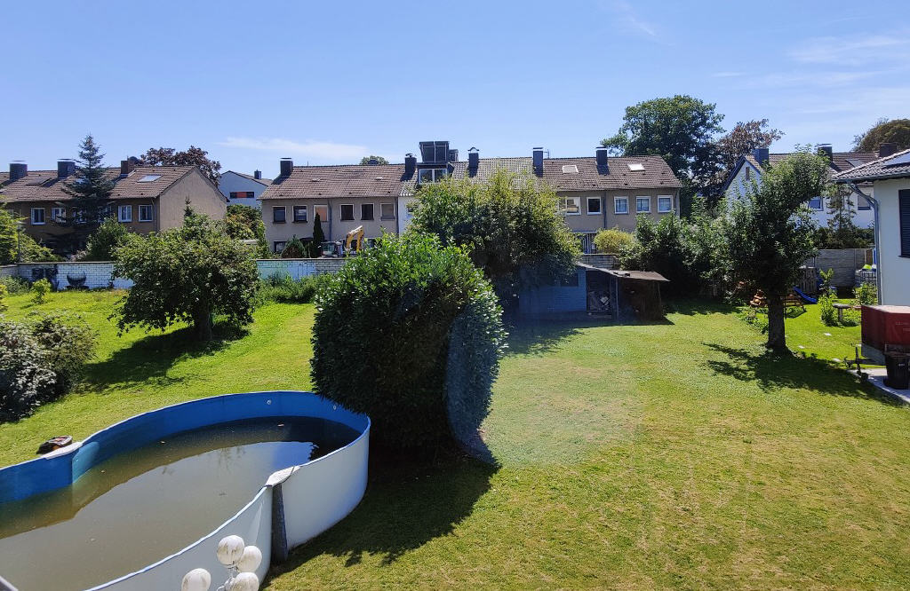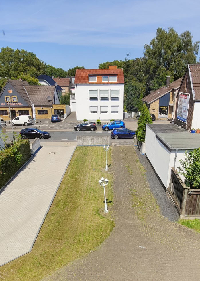 Diese hintere Fläche wird hier angeboten. Der Kaufpreis orientiert sich an dem aktuellen Bodenrichtwert von EUR 860,- / m², vermindert um die Kosten für Teilung / Vermessung und Herstellung der Zufahrt und der Leitungen. Die Teilung muss noch genehmigt werden. Die aktuellen Überlegungen sehen vor, die Zufahrt und die Leitungen an die linke Grenze des Grundstückes zu verlegen. Dafür muss allerdings die linke / äußere Garage des Hauses Nr. 51 a abgerissen werden. Die Kosten hierfür sind Verhandlungssache.