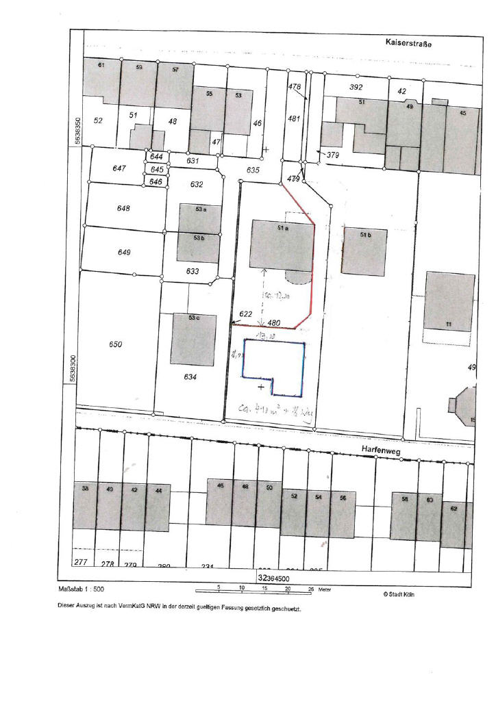 Das Grundstück Kaiserstraße 51 a hat eine Gesamtgröße inkl. Zufahrt von 1.116 m² und ist in der 2. Reihe (von der Kaiserstraße aus gesehen) mit einem freistehenden Ein- bis Zwei-Familienhaus bebaut. Dieses wird separat zum Kauf angeboten und ist bereits frei! Hinter diesem Haus liegt noch eine ca. 450 m² große Gartenfläche, die mit einem weiteren Einfamilienhaus in voraussichtlich 1-geschossiger Bauweise mit Sattel- oder Walmdach bebaut werden könnte. Denkbar wäre hier z.B. auch die Errichtung eines Bungalows.