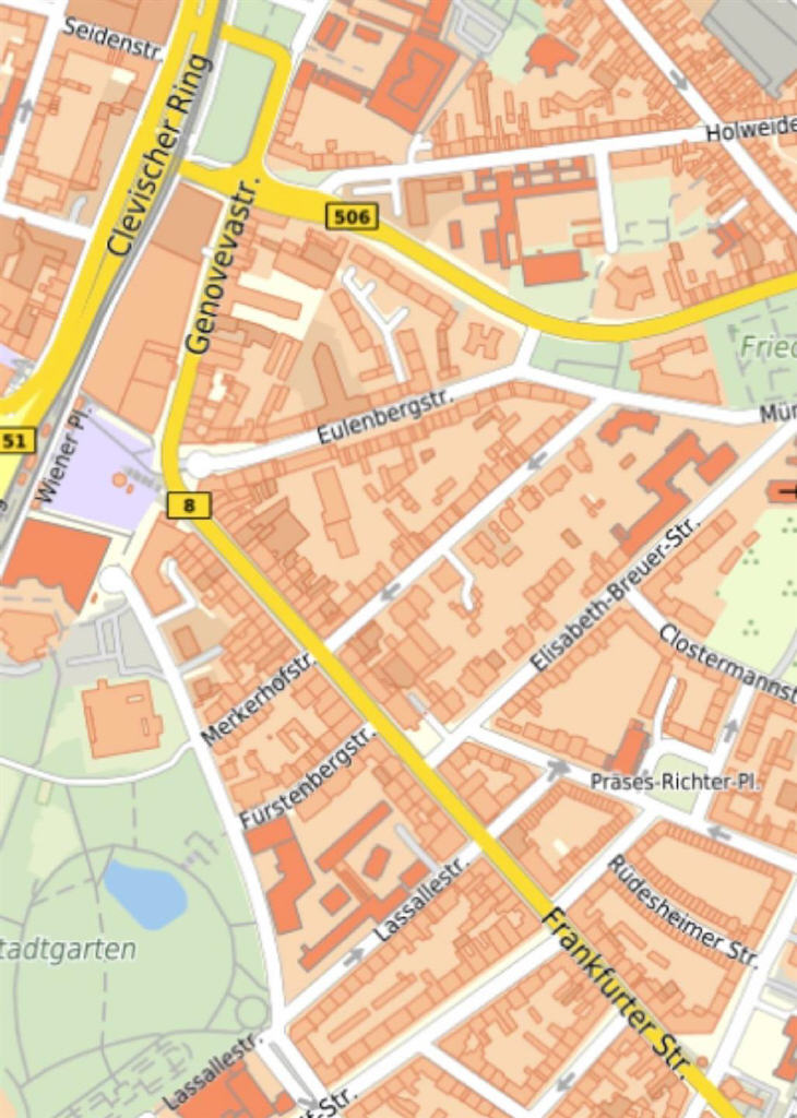 Mülheim ist ein sehr zentraler Stadtteil im rechtsrheinischen Köln. Der Charakter des Ortes ist vielschichtig: Rund um den wenige Fußminuten entfernten Wiener Platz pulsiert das Leben, aber es gibt auch grüne Flächen, z.B. den Mülheimer Stadtgarten, der nur wenige Schritte von dieser angebotenen Wohnung entfernt ist.